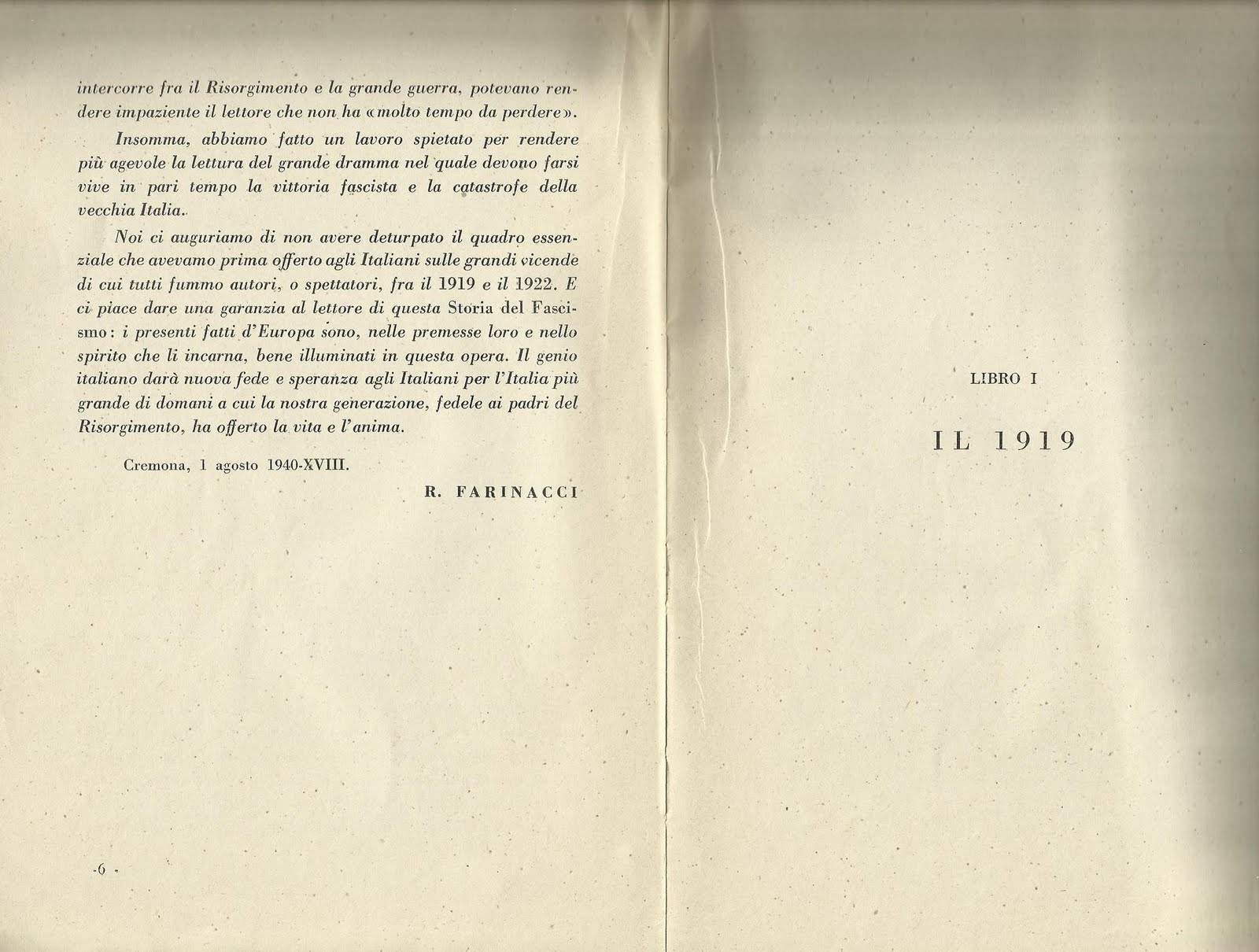Roberto Farinacci nacque ad Isernia il 16 ottobre del 1892, da famiglia d’origine campana. Il padre, Commissario di Pubblica Sicurezza, venne nel 1900 trasferito nel nord: tutta la famiglia si spostò dapprima momentaneamente a Tortona, nell’Alessandrino, e quindi in via definitiva a Cremona. Il giovane Farinacci lasciò presto la scuola per cercare un lavoro, che trovò all'età di 17 anni, nel 1909, come dipendente delle ferrovie di Cremona, con la mansione di telegrafista ferroviario; il lavoro gli piacque assai, tanto che volle continuare a svolgerlo fino al 1921, quando già aveva iniziato una vivace carriera politico-giornalistica. Negli anni ’10 inizia a seguire le vicende politiche nazionali, interessandosi in particolare al Partito Socialista. Si avvicina così al concittadino cremonese Bissolati, che, espulso dal PSI con Bonomi in seguito al congresso di Reggio Emilia del 1912 (al quale aveva avuto successo Mussolini), aveva dato vita al Partito Socialista Riformista Italiano (PSRI), divenendo antesignano della socialdemocrazia dei futuri Partito Socialista Unitario (PSU) e Partito Socialdemocratico Italiano (PSDI). Chiamato come collaboratore al giornale di Bissolati “L'Eco del popolo”, si segnala con articoli di un certo rilievo a favore della Guerra di Libia. Nel frattempo, ripresi gli studi, riesce a conseguire brillantemente la licenza liceale e si iscrive alla Facoltà di Giurisprudenza di Modena, dove si laureerà, per cause belliche solo nel 1923 in una sessione speciale per ex combattenti, con il celebre giurista Prof. Alessandro Groppali. Occupatosi della riorganizzazione del sindacato contadino socialista, inizia a mostrare insofferenza nei confronti dei socialisti riformisti e a collaborare volontariamente con “Il Popolo d'Italia” di Benito Mussolini. Allo scoppio della