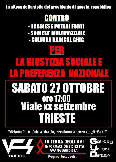 Sabato 27 ottobre, militanti della comunità di Avanguardia Nazionale, GUD e Veneto fronte skinhead a Trieste si ritrovano in viale XX settembre alle 17 per un'iniziativa politica.